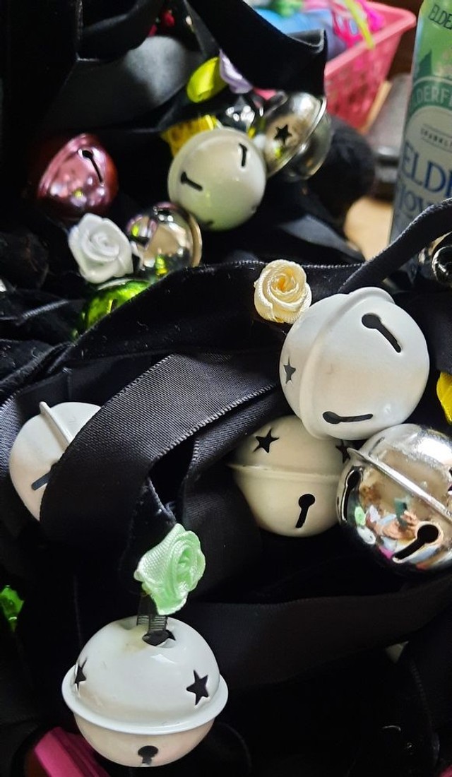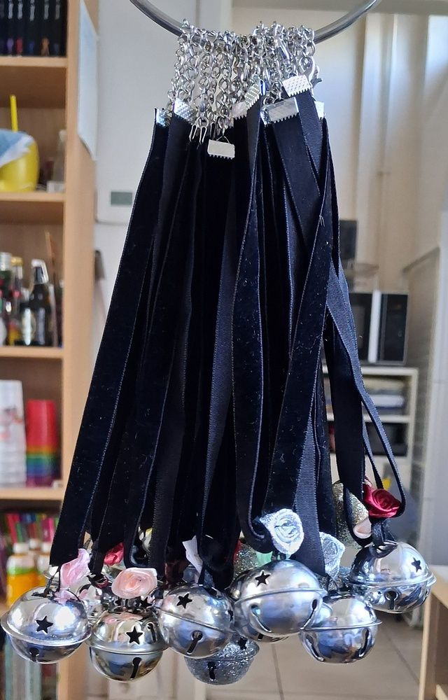 Belletjes zijn met een klein lintje aan een zwart fluwelen lint genaaid en gedecoreerd met een roosje. belletjes zijn verschillend van kleur en glans en ook roosjes zijn allemaal anders. Indien u er 1 wil kopen gelieve dan te laten weten welke kleur bel en roosje u wenst.